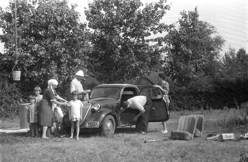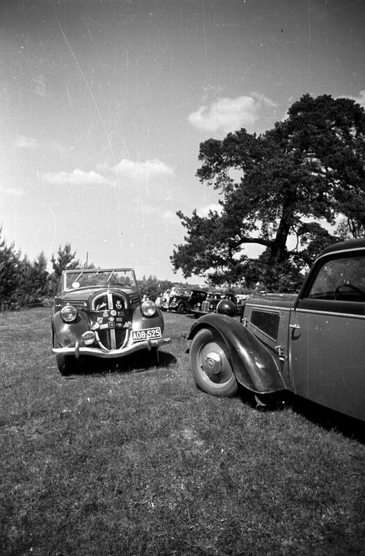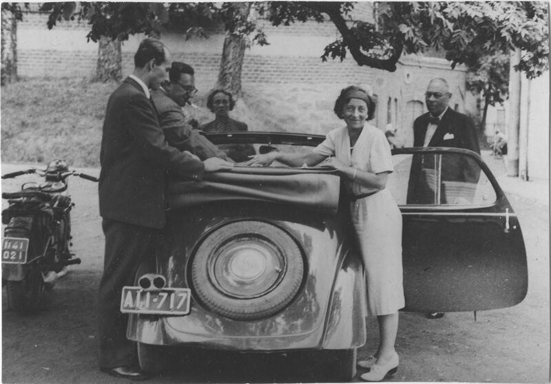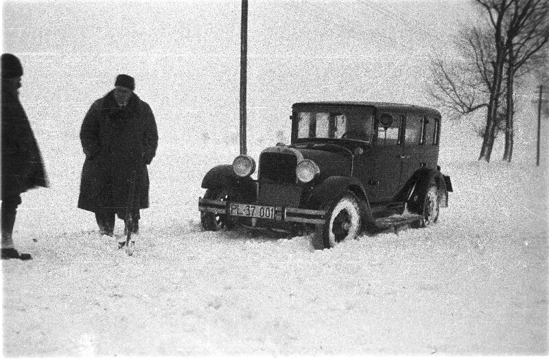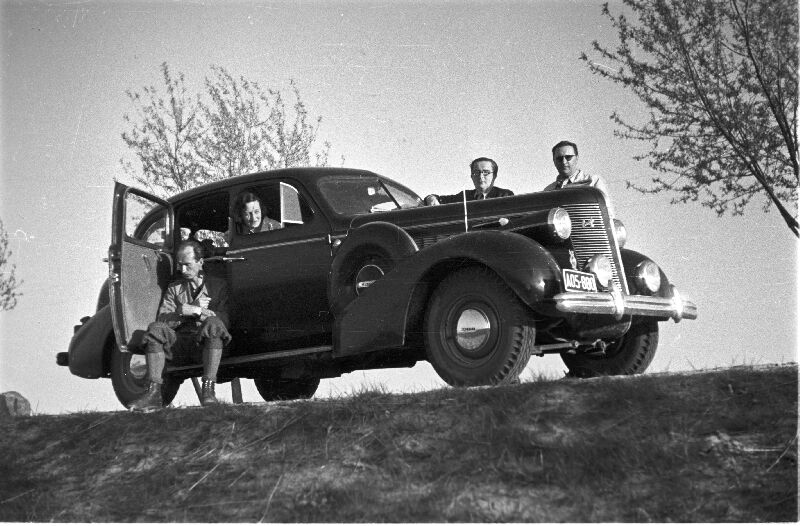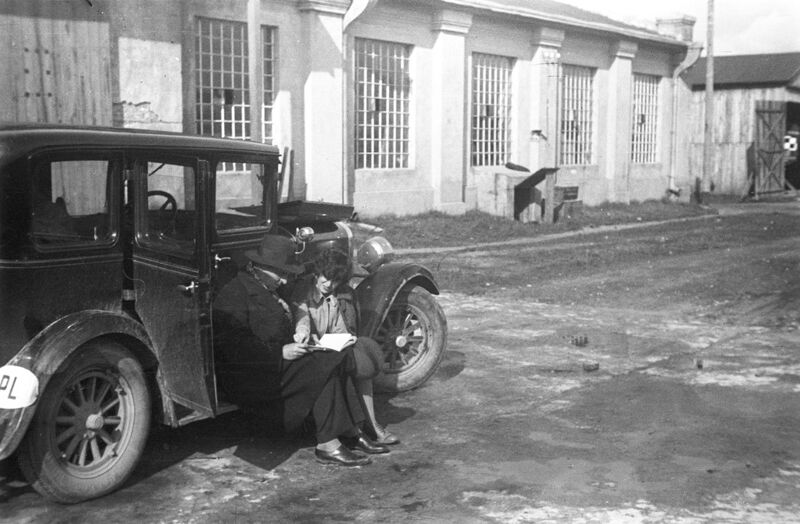 Fotograficzna wyprawa na Polesie. Samochód Zofii Chomętowskiej kupiony za honorarium wystawy Warszawa wczoraj, dziś, jutro. Na stopniu samochodu siedzi prawdopodobnie Antoni Wieczorek, w samochodzie Zofia Chomętowska, za samochodem stoją Tadeusz Przypkowski i Kazimierz Franaszek (źródło: Fundacja Archeologia Fotografii / Chomętowscy)