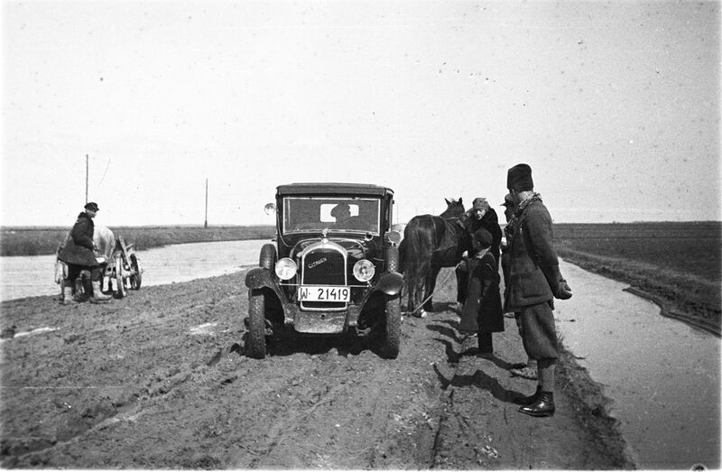 Próba wyciągnięcia samochodu zakopanego w błotnistej drodze na Polesiu (źródło: Fundacja Archeologia Fotografii / Chomętowscy)