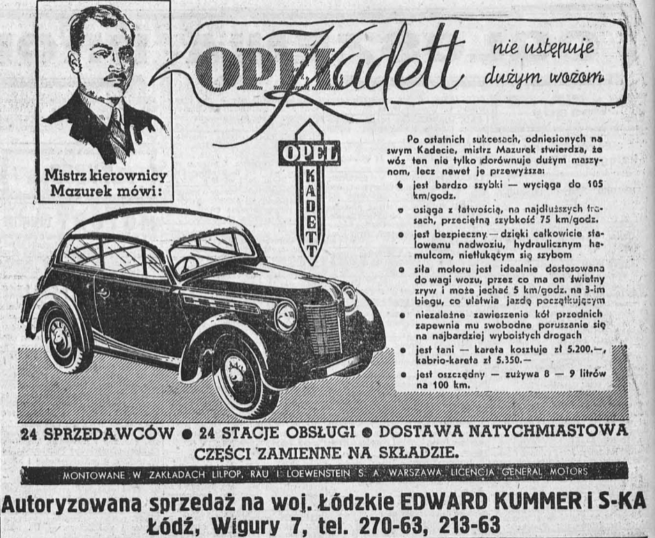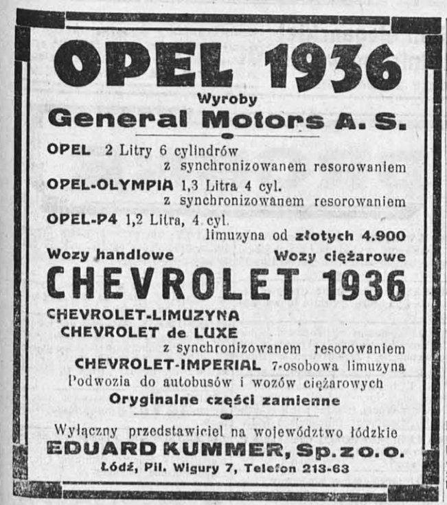 Jak głosi graffiti na jednym z bałuckich murów – koniec każdej rzeczy jest ważny. Lukę na łódzkim rynku po Braciach Kieszkowskich sprawnie wypełniło nowe przedstawicielstwo sprzedaży Opli oraz Chevroletów należące do Edwarda Kummera Seniora. Salon znajdował się przy ul. Pustej 7 (ob. ul. Wigury 7) i swoją działalność rozpoczął w 1931 roku. Równolegle z Kummerem w Łodzi działał jeszcze jeden salon samochodowy oferujący Chevrolety i bardzo szeroki asortyment akcesoriów samochodowych. Mowa o przedsiębiorstwie Zygmunta Dmowskiego, które mieściło się w wystawnym dwupiętrowym salonie w kamienicy przy ul. Piotrkowskiej 150 i było oficjalnym przedstawicielstwem General Motors na województwo łódzkie.