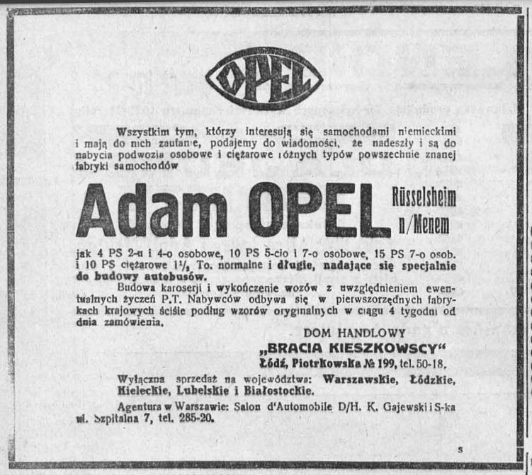Początki oficjalnej dystrybucji samochodów produkowanych w Rüsselsheim am Main przez zakłady Adama Opla sięgają w Łodzi 1928 roku. To wtedy zgodnie z dokumentami złożonymi do łódzkiego magistratu przedstawicielstwo Opla otworzyli Bracia Kieszkowscy. Chociaż robiąc przegląd łódzkiej prasy, szybko zorientujemy się, że Kieszkowscy już rok wcześniej zaczęli reklamować swój biznes. Początkowo samochody były dostępne w Domu Handlowym Bracia Kieszkowscy przy ul. Piotrkowskiej 199 w Łodzi, później przy tej samej ulicy, jednak pod numerem 113. Kieszkowscy zamknęli swój biznes w grudniu 1930 roku.